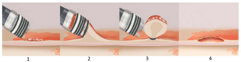 Systematische voorstelling van de Endoscopische Mucosale Resectie techniek B. (Bron: AMC)