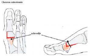 Bij een Chevron osteotomie wordt een knobbel aan de basis van de grote teen verwijderd en de stand van de grote teen gecorrigeerd. De grote teen wordt doorgezaagd en vastgezet met een schroef.