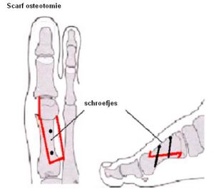 Bij een scarf osteotomie wordt eenderde deel van het kootje van de grote teen Z-vormig doorgezaagd en verplaatst zodat de teen rechter komt te staan. De botjes worden weer aan elkaar vastgemaakt met twee schroeven.