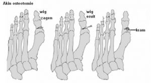 Tijdens de operatie worden de botjes van uw teen rechtgezet (“een osteotomie”). Met een fijn zaagje en beiteltje wordt de harde zwelling aan de binnenzijde van de voet (‘bunion’) verwijderd. De techniek die hierbij wordt toegepast hangt af van de grootte van de afwijking. De meest gebruikte technieken zijn de “Chevron osteotomie” en de ” Scarf osteotomie” van het middenvoetsbeen en de “Akin osteotomie” van het basiskootje. Met fijne pinnetjes of schroefjes worden de beentjes vastgezet tot ze genezen zijn in de juiste stand. De schroefjes kunnen blijven zitten tenzij u hier last van heeft.