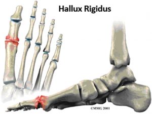 Het gewrichtskraakbeen vormt een glijdende, iets schokdempende laag tussen twee gewrichtsoppervlakten van ieder gewricht. Bij hallux rigidus worden de kraakbeenoppervlakken van het eerste teengewricht dunner door slijtage, ofwel artrose. Dit veroorzaakt pijn en stijfheid. Soms ontstaat hierbij ook scheefstand van de teen naar binnen, dan spreekt men van hallux valgus rigidus.