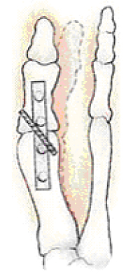 Hierbij wordt het resterende kraakbeen verwijderd en het gewricht vastgezet met een plaatje en schroeven. Dit noemt men artrodese. Het middenvoetsbeen en eerste kootje van de grote teen groeien hierbij aan elkaar vast. Zo is er geen gewricht meer dat pijn kan doen. Omdat de teen al vóór de operatie verstijfd was door de artrose, maakt het vastzetten de teen maar nauwelijks stijver.